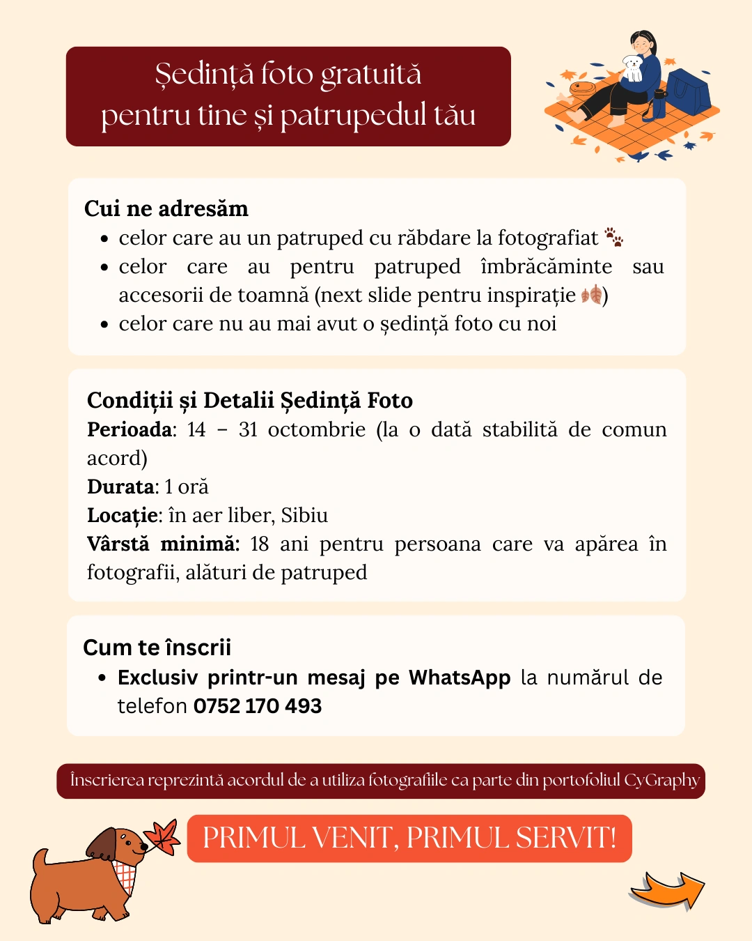 Cauți o activitate de toamnă pentru tine și patrupedul tău? Oferim o ședință foto profesională gratuită în Sibiu, dedicată stăpânilor și patrupezilor lor. Locurile sunt limitate – primul venit, primul servit.